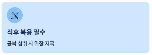 - 복용 시간: 산성이 강하므로 반드시 식사 중이나 식후에 섭취 (공복 금지)
