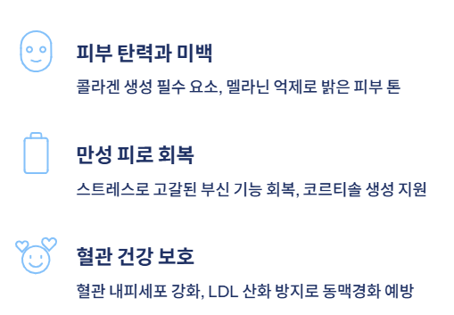 - 주요 기능: 강력한 항산화(노화 방지), 면역력 강화, 콜라겐 생성(피부 탄력)