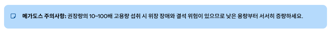 참고: 메가도스(Megadose)란 권장량의 10배~100배 이상을 섭취하는 요법입니다. 체질에 따라 효과를 보는 경우도 있지만, 위장 장애나 결석 부작용 위험이 있으므로 낮은 용량부터 서서히 늘려야 합니다.