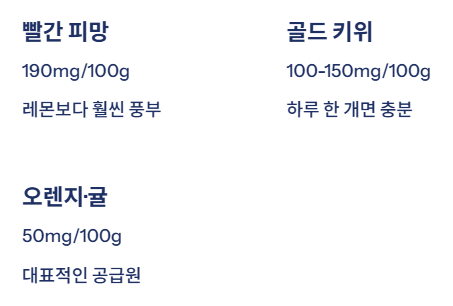 - 오렌지/귤: 약 50mg (대표적인 공급원)