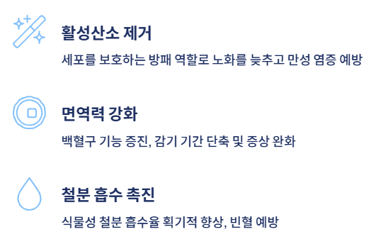 ⑤ 철분 흡수 촉진 빈혈이 있는 분들에게 필수입니다. 식물성 철분(비헴철)은 흡수율이 매우 낮은데, 비타민C와 함께 먹으면 흡수율이 획기적으로 높아집니다.