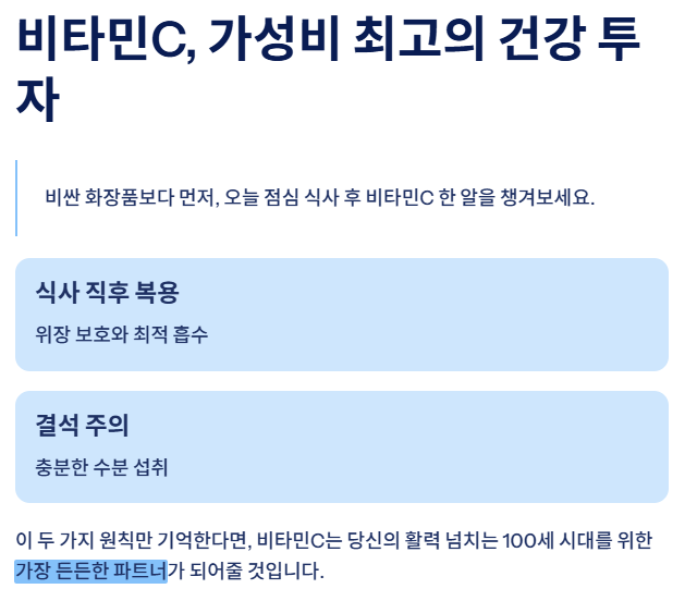 비타민C는 건강기능식품 중 가장 저렴하면서도 가장 드라마틱한 효과를 주는 '가성비 갑' 영양소입니다. 비싼 화장품을 바르기 전에, 오늘 점심 식사 후 비타민C 한 알을 먼저 챙겨보세요. 단, **'식사 직후'**와 **'결석 주의'**라는 두 가지 원칙만 기억한다면, 비타민C는 당신의 활력 넘치는 100세 시대를 위한 가장 든든한 파트너가 되어줄 것입니다.