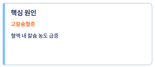 - 핵심 원인: 고칼슘혈증 (혈액 내 칼슘 농도 급증)