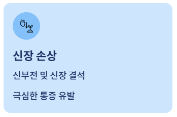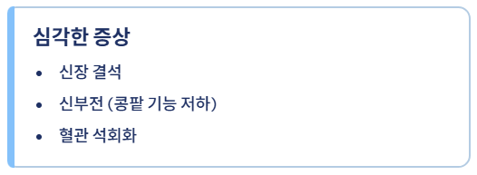 - 심각한 증상: 신장 결석, 신부전(콩팥 기능 저하), 혈관 석회화