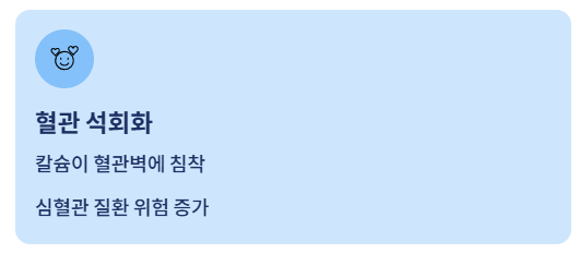 ④ 혈관 및 조직 석회화 가장 무서운 부작용 중 하나입니다. 떠돌아다니는 칼슘이 혈관 벽, 심장 근육, 폐 등에 달라붙어 딱딱하게 굳어버리는 현상입니다. 이는 동맥경화나 심혈관 질환의 위험을 높일 수 있습니다.