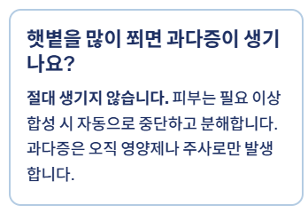 - 절대 생기지 않습니다. 우리 피부는 햇볕을 받아 비타민D를 합성할 때, 필요 이상이 되면 스스로 합성을 중단하고 분해해 버리는 조절 능력이 있습니다. 과다증은 오직 '먹는 영양제'나 '주사'로만 발생합니다.
