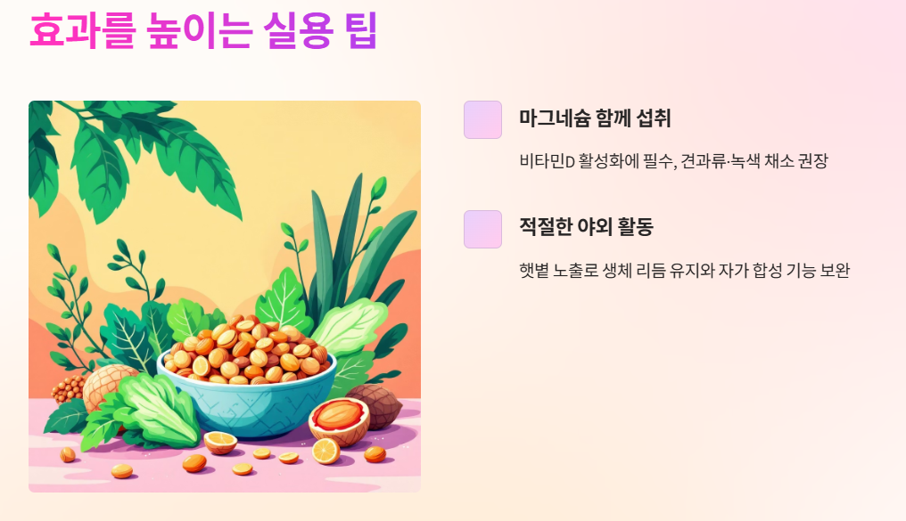 - 적절한 야외 활동 병행: 주사를 맞더라도 햇볕을 쬐는 야외 활동을 병행하면 생체 리듬 유지와 자가 합성 기능 유지에 도움이 됩니다.