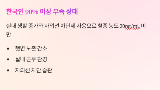 비타민D는 햇볕을 통해 피부에서 합성되는 필수 영양소이지만, 실내 생활 증가, 자외선 차단제 사용 등으로 인해 한국인의 90% 이상이 부족 상태(혈중 농도 20ng/mL 미만)에 놓여있습니다.