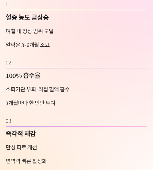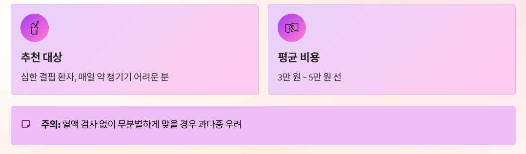 - 주의점: 혈액 검사 없이 무분별하게 맞을 경우 과다증 우려 있음