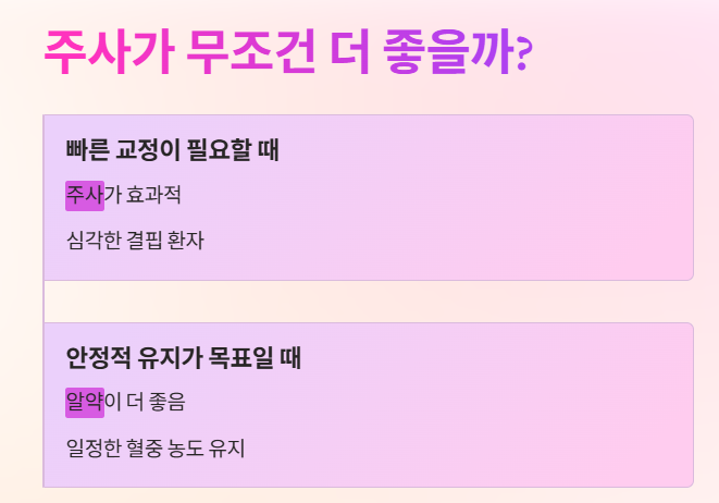 - 아닙니다. '빠른 교정'이 필요할 때는 주사가 좋지만, '안정적인 유지'를 위해서는 알약이 더 좋습니다. 급한 불은 주사로 끄고, 이후에는 알약으로 관리하는 전략을 많이 씁니다.