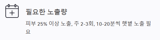 - 생활습관: 피부의 25% 이상을 노출한 채, 일주일에 23회, 1020분가량 햇볕을 쫴야 권장량에 가까운 비타민D가 합성됩니다.