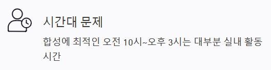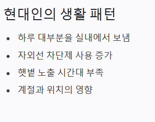 - 시간대: 비타민D 합성이 활발한 시간대는 오전 10시부터 오후 3시 사이인데, 이 시간대는 보통 실내 활동을 하는 경우가 많습니다.