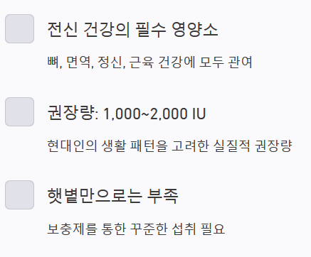 비타민D는 햇볕(자외선B)을 쫴야 피부에서 합성됩니다. 하지만 현대인의 생활 패턴상 햇볕만으로 권장량을 채우기는 어렵습니다.
