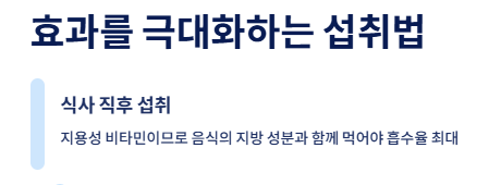 1. 반드시 '식사 직후'에 드세요 비타민D는 지방에 녹는 지용성 비타민입니다. 공복에 먹으면 흡수율이 50% 이하로 떨어질 수 있습니다. 점심이나 저녁 식사 직후, 음식에 섞여 있는 지방 성분과 함께 섭취할 때 흡수율이 가장 높습니다.