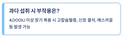 - 지용성이므로 몸에 축적됩니다. 하루 4,000IU 이상 장기 복용 시 고칼슘혈증, 신장 결석, 메스꺼움 등의 부작용이 생길 수 있으므로 권장량을 지키는 것이 좋습니다.