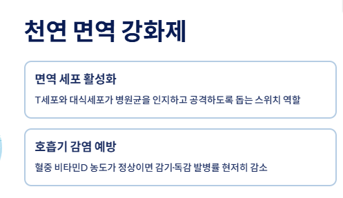 ② 천연 면역 강화제 비타민D는 우리 몸의 면역 세포(T세포, 대식세포)가 병원균을 인지하고 공격하도록 돕는 '스위치' 역할을 합니다. 혈중 비타민D 농도가 정상인 사람은 감기, 독감 등 호흡기 감염 질환의 발병률이 현저히 낮다는 연구 결과가 다수 존재합니다.