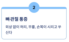 | 뼈·관절 통증 | 뚜렷한 외상 없이 허리, 무릎, 손목 등이 시리거나 쑤신다. |