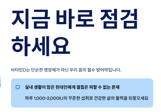 하루 1,000~2,000IU의 꾸준한 섭취를 통해 건강한 삶의 활력을 찾으시길 바랍니다. 지금 바로 내 몸의 비타민D 수치를 점검해보세요.