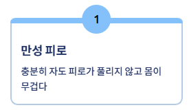 | 만성 피로 | 충분히 자고 쉬어도 피로가 풀리지 않고 몸이 무겁다. |