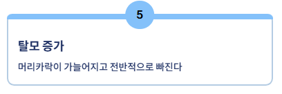 | 탈모 | 스트레스성 탈모와 달리 전반적으로 머리카락이 가늘어지고 빠진다. |