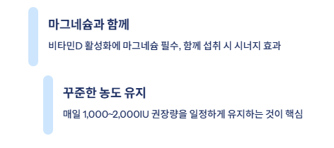 3. 꾸준한 농도 유지가 핵심 한 번에 많이 먹고 며칠 쉬는 것보다, 매일 권장량(성인 기준 1,000~2,000IU)을 꾸준히 섭취하여 혈중 농도를 일정하게 유지하는 것이 건강 개선에 훨씬 유리합니다.