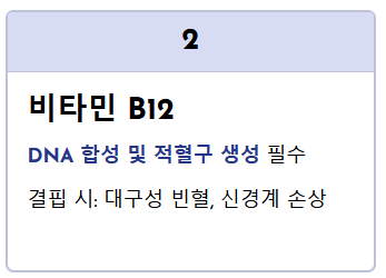 - 결핍 시: 적혈구가 커지는 대구성 빈혈과 신경계 손상을 유발합니다. 주로 동물성 식품에 존재합니다.