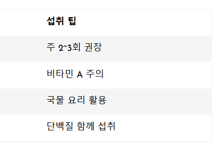 | 조개류 (바지락, 굴, 홍합) | 3.5 ~ 10.0 | 굴은 아연도 풍부하며, 조개류는 헴철 함량이 높아 국물 요리에 활용하기 좋음. |