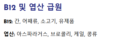 - 결핍 시: 비타민 B12 결핍과 유사하게 대구성 빈혈을 유발하며, 임산부에게 특히 중요합니다.