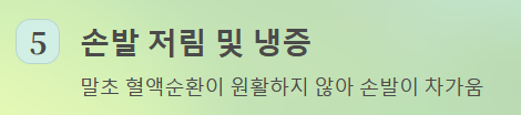 - 손발 저림 및 냉증: 말초 혈액순환이 원활하지 않아 손발이 차갑고 저리는 느낌이 자주 발생합니다.