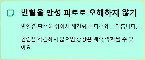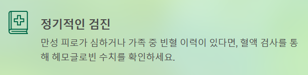 - 빈혈을 만성 피로로 오해하지 않기: 빈혈은 단순히 쉬어서 해결되는 피로와는 다릅니다. 원인을 해결하지 않으면 증상은 계속 악화될 수 있습니다.