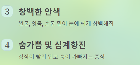 - 숨가쁨 및 심계항진: 몸이 부족한 산소를 채우기 위해 심장이 빨리 뛰거나 숨이 가빠지는 증상이 나타납니다.