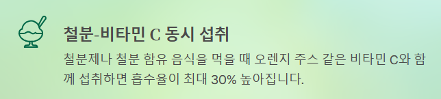 - 철분-비타민 C 동시 섭취: 철분제나 철분 함량이 높은 음식을 먹을 때 오렌지 주스 같은 비타민 C가 풍부한 식품과 함께 섭취하면 흡수율이 최대 30%까지 높아집니다.