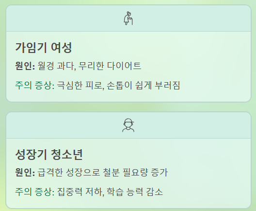 | 가임기 여성 | 월경 과다로 인한 철분 손실, 무리한 다이어트 | 극심한 피로, 손톱이 쉽게 부러짐(스푼형 손톱) |