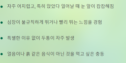 - 어지럼증 및 두통: 갑자기 일어설 때 발생하는 기립성 저혈압과 함께 어지럼증이나 두통이 동반됩니다.