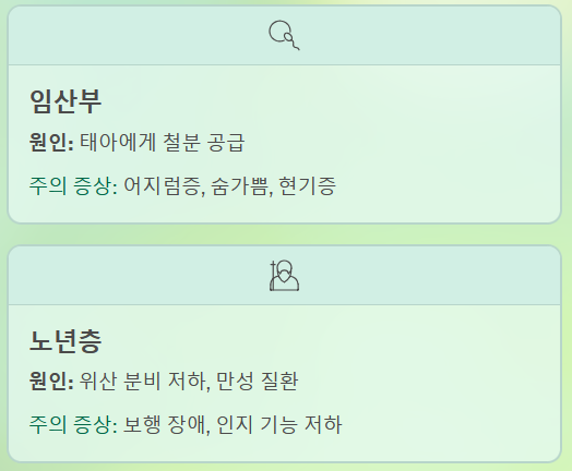 | 임산부 | 태아에게 철분을 공급하면서 오는 상대적 부족 | 어지럼증, 숨가쁨, 현기증 |