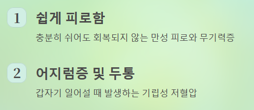 - 쉽게 피로함: 충분히 쉬어도 회복되지 않는 만성적인 피로와 무기력증이 가장 흔합니다.