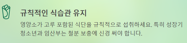 - 규칙적인 식습관 유지: 영양소가 고루 포함된 식단을 규칙적으로 섭취하고, 특히 성장기 청소년이나 임산부는 철분 보충에 신경 써야 합니다.