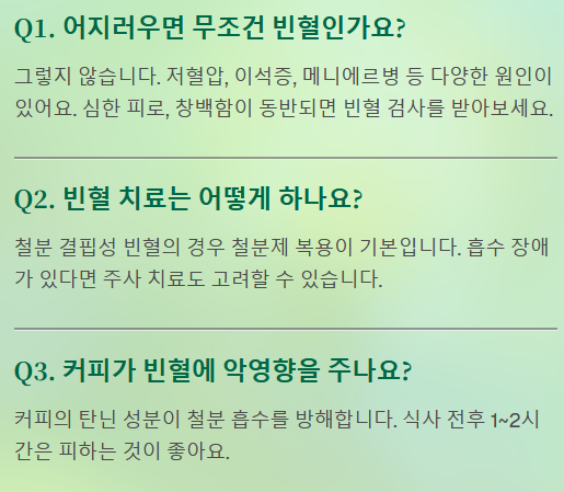 Q1: 어지러우면 무조건 빈혈인가요? A: 그렇지 않습니다. 어지럼증은 저혈압, 이석증, 메니에르병 등 다양한 원인으로 발생할 수 있습니다. 다만, 특히 심한 피로, 창백함이 동반된다면 빈혈 검사를 받아볼 필요가 있습니다.