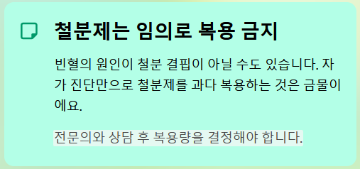 - 철분제는 임의로 복용 금지: 빈혈의 원인이 철분 결핍이 아닐 수도 있으므로, 자가 진단만으로 철분제를 과다 복용하는 것은 금물입니다. 전문의와 상담 후 복용량을 결정해야 합니다.