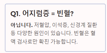 | Q1 | 어지럼증이 있으면 무조건 빈혈인가요? | 아닙니다. 어지럼증은 저혈압, 이석증(귀 내부 문제), 신경계 질환 등 다양한 원인으로 발생합니다. 빈혈은 혈액 검사로만 확진할 수 있습니다. |