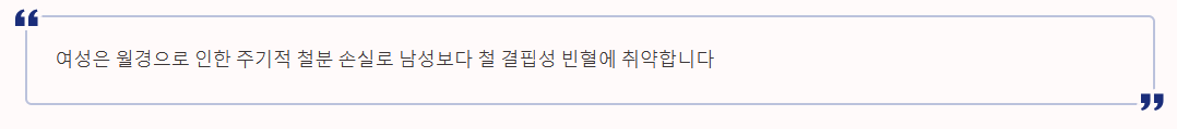 | Q4 | 여성에게 빈혈 증상이 더 자주 나타나는 이유는 무엇인가요? | 여성은 매월 월경으로 인해 일정량의 혈액과 철분을 주기적으로 손실하기 때문에 남성보다 철 결핍성 빈혈에 취약합니다. |