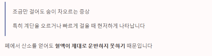 - 숨 가쁨 (호흡 곤란): 조금만 걸어도 숨이 차오르는 증상. 특히 계단을 오르거나 빠르게 걸을 때 현저하게 나타납니다. 폐에서 산소를 얻어도 혈액이 제대로 운반하지 못하기 때문입니다.