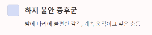 - 하지 불안 증후군: 밤에 다리에 불편하고 불쾌한 감각이 느껴져 다리를 계속 움직이고 싶은 충동을 느낍니다.