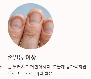 - 손발톱의 이상: 손발톱이 잘 부러지거나, 표면이 거칠어지고, 드물게는 손톱이 숟가락처럼 위로 휘어지는 스푼 네일(Koilonychia) 현상이 나타납니다.