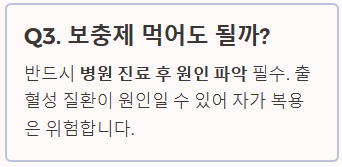 | Q3 | 빈혈 증상 때문에 보충제를 먹어도 될까요? | 빈혈이 의심되면 반드시 병원 진료 후 원인을 파악해야 합니다. 특히 출혈성 질환(위장관 출혈 등)이 원인일 수 있으므로 자가 진단 및 자가 복용은 위험할 수 있습니다. |