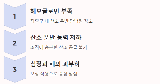 - 원리: 헤모글로빈 부족 → 산소 운반 능력 저하 → 심장과 폐의 과부하.