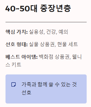 - 중장년층 비율이 높다면: 상품권, 건강 키트, 실용적인 생활용품 등 실패 없는 안전한 선택을 하세요.
