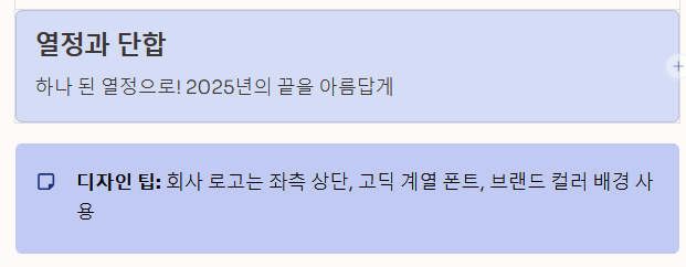| 공식 행사 | 진지함, 격식, 비전 | 노고 치하, 미래 지향 | 네이비/블랙 배경 + 금색 텍스트 |