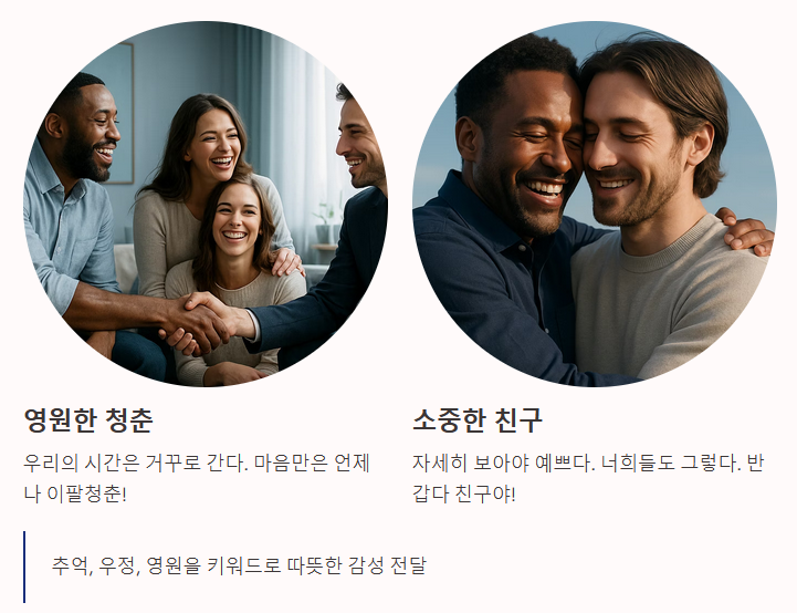 | 동창회 | 따뜻함, 향수, 편안함 | 우정, 청춘, 추억 | 복고풍(칠판, 교복) 또는 꽃무늬 |