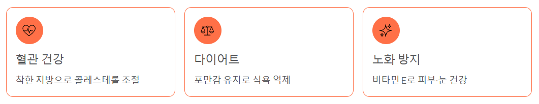 - 혈관 건강: 불포화지방산이 콜레스테롤 수치를 조절하여 고혈압과 동맥경화를 예방합니다.